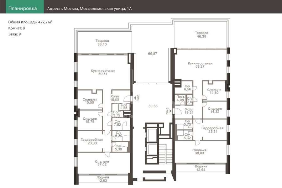 Предлагается пентхаус общей площадью 422,2 кв. м. в ЖК Вишневый сад. Корпус F. Пентхаус имеет свободную планировку, что позволяет создать жилое пространство на любой вкус. Планировка предполагает кухню-гостиную, 6 спален, гардеробные, 7 санузла, постирочную, террасы. Есть общий холл, который можно присоединить к квартире. В наличии машиноместа в подземном паркинге. «Вишневый Сад» – это новый жилой комплекс премиум-класса, расположенный в экологически благоприятном районе столицы на Мосфильмовской улице в окружении зелени заказника Долины реки Сетунь, площадью 3 га. Проект состоит из 8 клубных особняков в современном европейском стиле. Фасады зданий выполнены из натурального камня. Большие панорамные окна, авторский дизайн входных групп. Подземный паркинг на 460 машиномест и отдельно выделенный этаж с кладовыми помещениями. Просторная благоустроенная территория, площадью 4.3 Га. Двор без машин, фитнес клуб с бассейном и spa, детские площадки, частный детский сад, кафе. Жители комплекса могут также наслаждаться прогулками по Воробьевым горам и набережной Москва-реки. Ближайший сосед проекта – киностудия «Мосфильм».