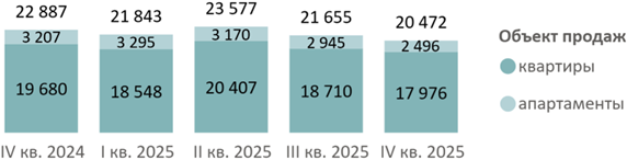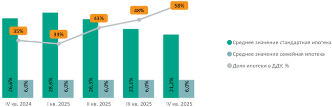 Несмотря на снижение доли ипотечных сделок за год на 5 п.п. (до 47%), в течение года показатель демонстрировал рост – с 33% в начале 2024 года до 58% к концу 2025 года. Рост в IV квартале был обусловлен в первую очередь ожиданием изменений в программе семейной ипотеки, которые вступят в силу с 1 февраля 2026.