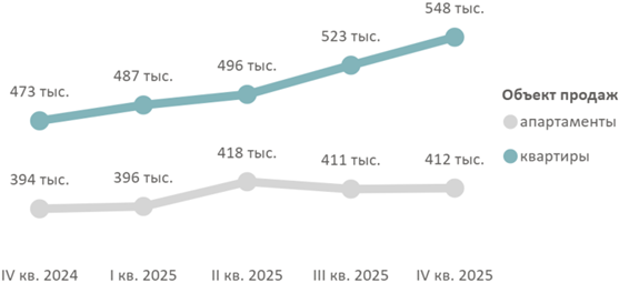 По подсчетам аналитиков «Метриум», средневзвешенная цена квадратного метра квартир и апартаментов на конец декабря 2025 года составила 533 340 рублей (+5% за квартал, +15% за год). Средневзвешенная цена метра в квартирах достигла 547 880 рублей (+5% за квартал, +16% за год), в апартаментах – 412 160 рублей (+0,2% за квартал, +5% за год).