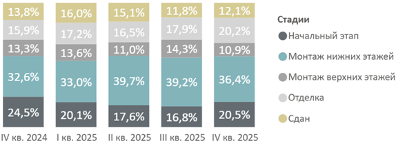 В течение года наблюдалась тенденция к сокращению доли предложения на начальном этапе строительства, но в IV квартале показатель восстановился (20,5%, +3,7 п.п. за квартал, -4 п.п. за год) за счет стартов новых проектов и корпусов в уже реализующихся проектах. Глобально сохраняется тенденция к сокращению доли предложения на котловане на фоне пониженной девелоперской активности.