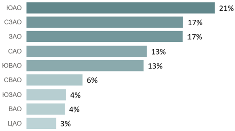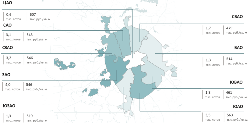 Максимальный объем предложения сосредоточен в ЗАО (4 тыс. лотов, -4% за год), ЮАО (3,5 тыс. лотов, -25%) и СЗАО (3,2 тыс. лотов, -12%). За год объем предложения сократился во всех округах за исключением ВАО (1,3 тыс. лотов, +32%) и ЮВАО (1,8 тыс. лотов +12%).