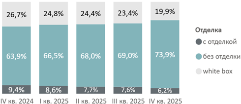 В структуре предложения по типу отделки выросла доля предложения без отделки (73,9%, +10 п.п. за год), сократилась доля предложения с чистовой отделкой (6,2%, -3,2 п.п.) и c отделкой white box (19,9%, -6,8 п.п.).