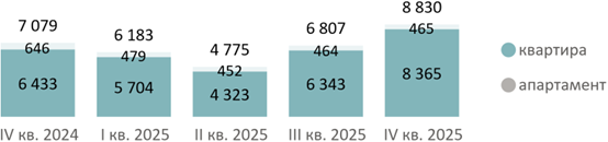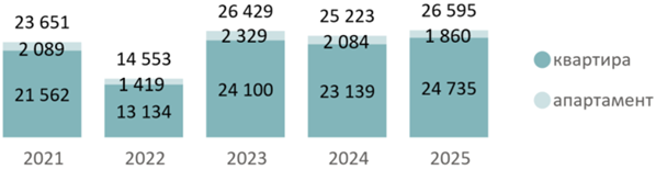 По итогам 2025 года на рынке новостроек бизнес-класса было зарегистрировано 26 595 сделки по ДДУ, что на 5% больше, чем в 2024 году. Минимальный спрос в 2025 году наблюдался во II кв. – 4 775 ДДУ за квартал. В IV квартале показатель спроса вырос на 30% к III кварталу и составил 8 830 ДДУ, что на 25% выше, чем в IV квартале 2024 года и является максимальным квартальным показателем в году.
