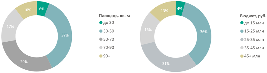 В бюджете до 15 млн рублей предлагается 4% лотов (-14 п.п. за год), в диапазоне 15-25 млн реализуется 36% квартир и апартаментов (-2 п.п. за год).