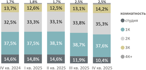 Пик спроса на новостройки бизнес-класса в конце года, помимо сезонного фактора, был связан с фактором опережающих покупок из-за ожиданий изменений по семейной ипотеке, что подтверждается ускоренным вымыванием наиболее доступных форматов, в первую очередь студий (10,4%, -4,2 п.п. за год). Вероятна коррекция спроса в I квартале 2026 года относительно высоких показателей конца предыдущего года, после реализации части отложенного спроса.