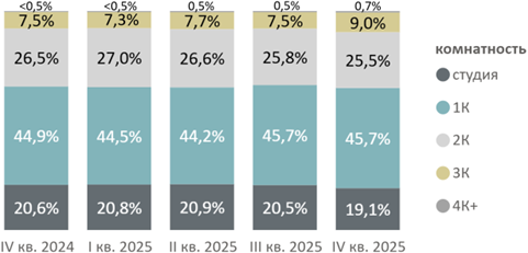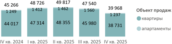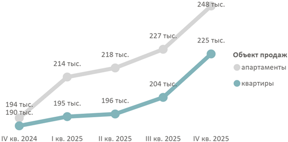 По подсчетам аналитиков «Метриум», средневзвешенная цена квадратного метра квартир и апартаментов по итогам IV квартала 2025 года составила 225 320 руб. за кв. м (+10% за квартал, +18% за год). Средневзвешенная цена квартир составила 224 790 руб. за кв. м (+10% за квартал, +18% за год), апартаментов – 247 710 (+9% за квартал, +28% за год).