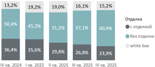 В структуре предложения сохраняется тенденция к росту доли без отделки (60,9%, +10,5 п.п. за год) и сокращению доли с чистовой отделкой (23,9%, -12,5 п.п.). Доля форматов white box относительно стабильна (15,2%, +2 п.п.).