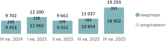 Помимо сезонного фактора, опережающее вымывание объемов было спровоцировано ажиотажным спросом в преддверии ожидаемых изменений в программе семейной ипотеки. Пик активности пришелся именно на IV квартал, когда было заключено 19 293 ДДУ (+75% за квартал, +99% за год).
