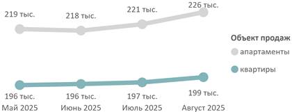 По подсчетам аналитиков «Метриум», средневзвешенная цена квадратного метра квартир и апартаментов по итогам августа 2025 года составила 199 520 руб. (+1% за месяц, +6% за год). Средневзвешенная цена квартир – 198 890 руб. за кв. м (+1% за месяц, +6% за год), апартаментов – 225 660 руб. за кв. м (+2% за месяц, +26% за год).