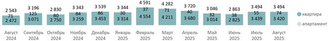 В августе 2025 года на рынке новостроек Московской области было зарегистрировано 3,5 тыс. ДДУ (без изменений за месяц, +37% за год), с апартаментами – 74 сделки, с квартирами – 3,4 тыс.