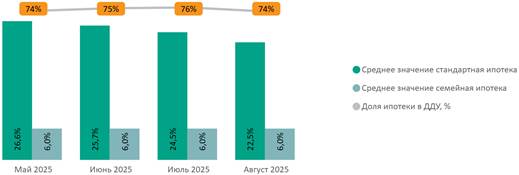 Доля сделок с привлечением ипотечного кредита к июлю достигла 74%, относительно июля 2025 года показатель сократился на 2 п.п. Средняя ставка по стандартной ипотеке в августе составила 22,5% (-2 п.п. за месяц).