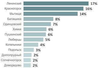 Среди округов по объему сделок в августе лидируют Ленинский г. о. (17%), Красногорск (16%) и Мытищи (14%).
