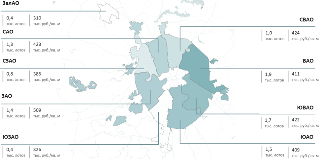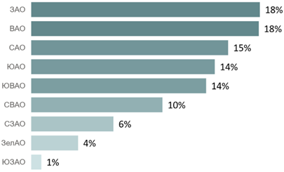 Максимальная динамика прироста предложения отмечается в ЗелАО и СЗАО за счет стартов новых корпусов в проектах «Зеленый парк» и «Квартал Мит» соответственно, тогда как максимальный прирост цены зафиксирован в САО (+6%) за счет старта нового корпуса в проекте «Нарвин» по цене выше средней по округу.