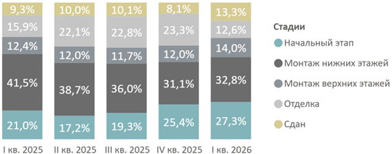 Несмотря на сокращение числа стартов продаж, доля предложения в корпусах на начальном этапе за год увеличилась на 6,3 п.п. и составила 27,3%. Однако данный рост носит преимущественно статистический характер. Он обусловлен не притоком новых объемов, а более активным вымыванием форматов на поздних стадиях строительной готовности. Фактический объем предложения на этапе котлована за год сократился на 23% до 2,8 тыс. лотов.