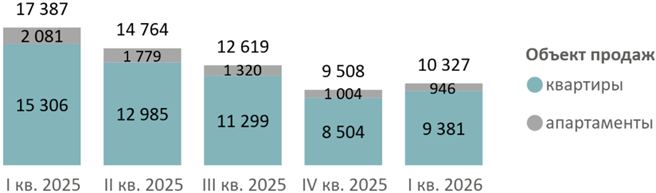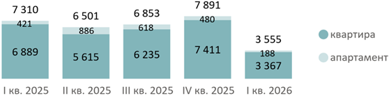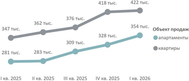 По подсчетам аналитиков «Метриум», средневзвешенная цена квадратного метра квартир и апартаментов по итогам I квартала 2026 года составила 416 520 руб. (+2% за квартал, +23% за год). Средневзвешенная цена квартир – 422 090 руб. за кв. м (+1% за квартал, +22% за год), апартаментов – 353 600 руб. за кв. м (+8% за квартал, +26% за год).