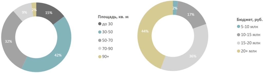 Распределение предложений на первичном рынке недвижимости массового сегмента по площадям и бюджетам, количество лотов