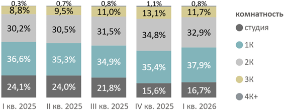 В структуре предложения по типологии за квартал не произошло существенных изменений, однако в годовом сопоставлении отмечается сокращение доли студий (16,7%, -7,4 п.п.) на фоне постепенного исчерпания с рынка квартир площадью менее 28 кв. м.