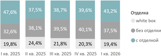 За счет стартовавших корпусов доля предложения с чистовой отделкой за квартал выросла на 3,6 п.п. до 43,2%, а доля без отделки (37,5%, -2,6 п.п.) и white box (19,4%, -0,9 п.п.) сократилась. Причем за год абсолютное число квартир с чистовой отделкой сократилось на 46% до 4,5 тыс. лотов.
