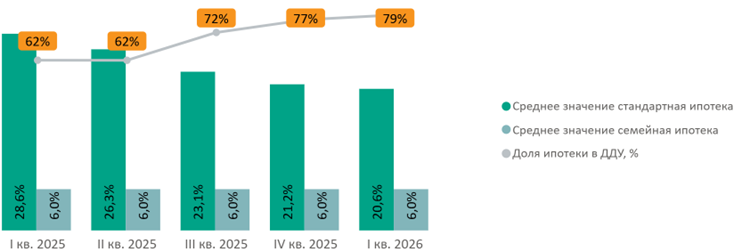 Доля сделок с ипотекой за квартал выросла на 2 п.п. до 79%., а средняя ставка по рыночной ипотеке сократилась на 1,2 п.п. до 20,6%.