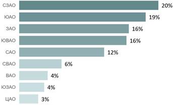 Если в предыдущем квартале по доле сделок лидировал ЮАО, то в III квартале максимальное число сделок зафиксировано в СЗАО (20%), на втором месте ЮАО (19%), а на третьем – ЗАО (16%). По числу сделок в сегменте лидируют Shagal (570 ДДУ), City Bay (368 ДДУ) и STONE Rise (239 ДДУ).