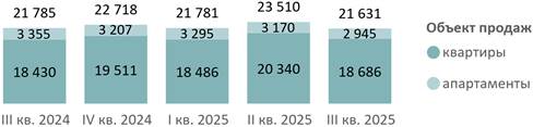 По данным «Метриум», в III квартале 2025 года на рынке новостроек бизнес-класса экспонировалось 21,6 тыс. лотов (-8% за квартал, -1% за год) в 143 проектах. Из них 18,7 тыс. – квартиры (-8% за квартал, +1% за год) и 2,9 тыс. – апартаменты (-7% за квартал, -12% за год).
