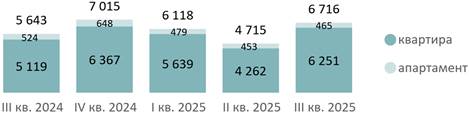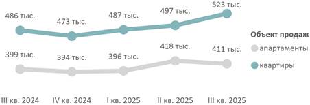 По подсчетам аналитиков «Метриум», средневзвешенная цена квадратного метра квартир и апартаментов по итогам III квартала 2025 года составила 509 320 руб. (+5% за квартал, +7% за год). Средневзвешенная цена квартир – 522 810 руб. за кв. м (+5% за квартал, +8% за год), апартаментов – 411 940 руб. за кв. м (-2% за квартал, +3% за год).