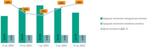 Доля сделок с привлечением ипотечного кредита в III квартале составила 48% (+4 п.п. за квартал, -2% за год). Средняя ставка по рыночной ипотеке за квартал сократилась на 3,2 п.п. до 23,1%.