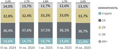 В распределении предложения по типологии за квартал сократилась доля предложения студий (11,9%, -2,7 п.п. за квартал), а доля однокомнатных (38,7%, +0,6 п.п.) и двухкомнатных (33,7%, +0,7 п.п.) форматов выросла. В распределении экспозиции по диапазонам площади доля лотов до 30 кв. м по итогам III квартала составила 8% (-7 п.п. за квартал), что подтверждает тенденцию к сокращению малометражных форматов.