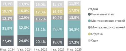 Из-за снижения числа новых проектов доля квартир на котловане продолжает сокращаться и по итогам квартала составила 17,2% (-0,8 п.п. за квартал). Наибольшая доля предложения приходится на объекты, находящиеся на стадии возведения нижних этажей (39,3%, -0,5 п.п.). За квартал доля предложения в сданных корпусах сократилась на 3,4 п.п. и составила 11,8%.