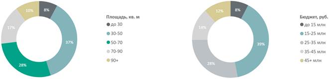 Распределение предложений на первичном рынке недвижимости бизнес-класса по площадям и бюджетам, количество лотов