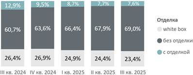 В структуре предложения по типу отделки сохраняется тенденция к росту доли предложения без отделки (69,0%, +1,1 п.п. за квартал) и сокращению предложения форматов с чистовой отделкой (7,6%, -0,1 п.п.) и отделкой white box (23,4%, -1 п.п.).