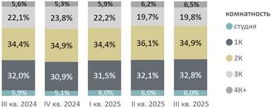 В структуре предложения по типологии не произошло значительных изменений. Максимальная доля приходится на двухспальный формат (34,9%, -1,2 п.п. за квартал)