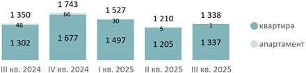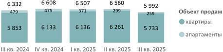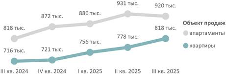 По подсчетам аналитиков «Метриум», средневзвешенная цена квадратного метра квартир и апартаментов по итогам III квартала 2025 года составила 823 410 руб. (+5% за квартал, +14% за год). Средневзвешенная цена квартир – 818 320 руб. за кв. м (+5% за квартал, +14% за год), апартаментов – 920 050 руб. за кв. м (-1% за квартал, +12% за год).