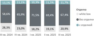 Максимальную долю предложения составляет формат без отделки (67,4%, -2 п.п. за квартал), на предложения с чистовой отделкой приходится 11,7% (+0,2 п.п.) объема, с отделкой white box – 20,9% рынка (+1,8 п.п.).