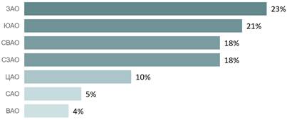 В III квартале максимальное число сделок было зарегистрировано в ЗАО (23%, +3 п.п. за квартал). Среди проектов по числу сделок лидируют Dream Riva (121 ДДУ), «Остров» (105 ДДУ)[2] и «Родина Парк» (95 ДДУ).