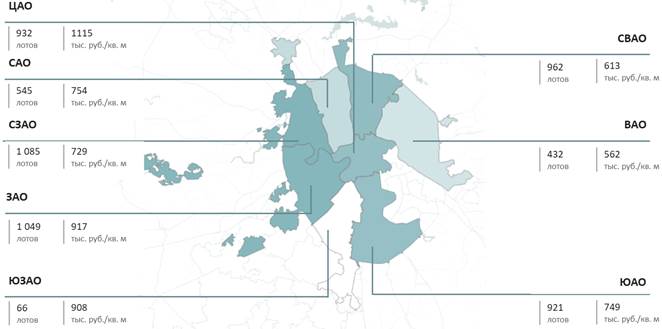 Среди округов по объему предложения лидирует СЗАО (1,1 тыс. лотов), на втором месте – ЗАО (1,0 тыс. лотов)