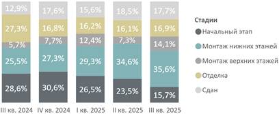 На фоне сокращения стартов новых проектов в премиум-классе третий квартал подряд отмечается тенденция к сокращению доли предложения на начальной стадии строительства (15,7%, -7,8 п.п. за квартал) и рост доли предложения в корпусах на стадии монтажа этажей (49,4%, +7,8 п.п. за квартал).