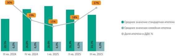 Доля сделок с привлечением ипотечного кредита в III квартале составила 27% (+9 п.п. за квартал, -3 п.п. за год).