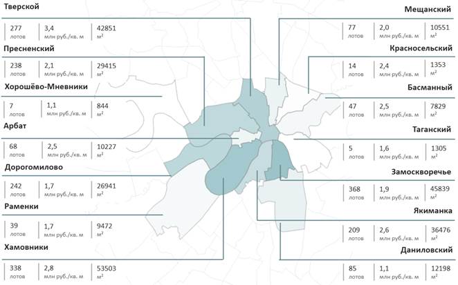 Среди районов по объёму экспозиции лидируют Хамовники (53,5 тыс. кв. м, 338 лотов), Замоскворечье (45,8 тыс. кв. м, 368 лотов) и Тверской (42,9 тыс. кв. м, 277 лотов). При этом в Хамовниках предлагаются объекты с максимальной средней ценой – 2,8 млн руб. за кв. м.