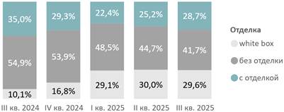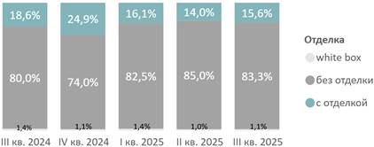 В распределении предложения по типам отделки не произошло значительных изменений. В элитном классе больше всего предлагается вариантов без отделки (83,3%, -1,7 п.п. за квартал) как и в делюкс-классе (41,7%, -3 п.п. за квартал).