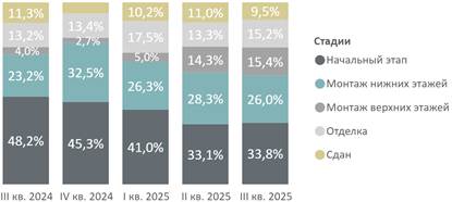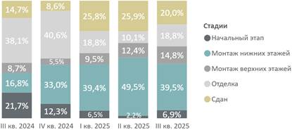 В элитном классе не произошло значительных изменений, но в годовом периоде на фоне сокращения вывода на рынок новых проектов сохраняется тенденция к сокращению предложения на котловане (33,8%, +0,7 п.п. за квартал, -14,4 п.п. за год).