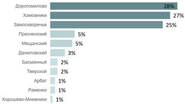 Наибольшая покупательская активность зафиксирована в районах Дорогомилово (28%), Хамовники (27%) и Замоскворечье (25%). Лидерами по количеству заключенных договоров долевого участия стали: «Бадаевский» (38 ДДУ) в Дорогомилово, проект Luzhniki Collection (28 ДДУ) в Хамовниках и «Татарская 35» (24 ДДУ) в Замоскворечье.