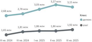 По подсчетам аналитиков «Метриум», средневзвешенная цена квадратного метра квартир и апартаментов по итогам III квартала 2025 года составила 2,37 млн руб. (+0,3% за квартал, +18% за год). Средневзвешенная цена элитного класса – 1,92 млн руб. за кв. м (+4% за квартал, +17% за год), делюкс-класса – 3,15 млн руб. за кв. м (-4% за квартал, +17% за год).