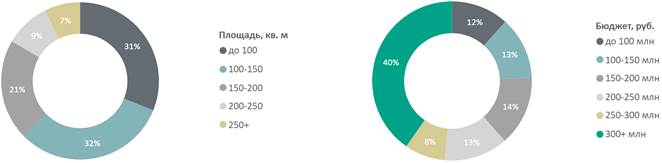 Распределение предложений на первичном рынке недвижимости высокобюджетного сегмента по площадям и бюджетам, количество лотов