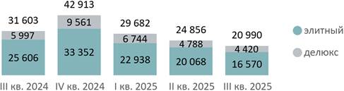 По данным «Метриум», в III квартале 2025 года на рынке новостроек высокобюджетного сегмента экспонировалось 2 тыс. лотов (-3% за квартал, +6% за год) в 60 проектах. Из них 1,8 тыс. – квартиры (-3% за квартал, +19% за год) и 0,3 тыс. – апартаменты (-1% за квартал, -36% за год). Объем предложения в элитном сегменте сократился (1,4 тыс. лотов, -5% за квартал), в делюкс-классе показатель практически не изменился (0,66 тыс. лотов, +1%).