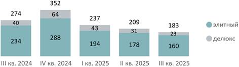 В III квартале 2025 года на рынке новостроек высокобюджетного сегмента было зарегистрировано 183 ДДУ (-12% за квартал, -33% за год) общей площадью 21 тыс. кв. м (-16% за квартал, -34% за год).