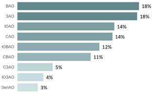 В ноябре максимальное число сделок было зарегистрировано в ВАО (18%, -1 п.п. за месяц), второе место по числу сделок приходится на ЗАО (18%, +6 п.п.), третью позицию занимает ЮАО (14%, -2 п.п.).