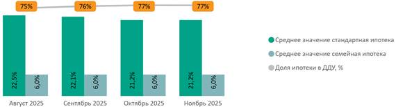 Доля сделок с привлечением ипотечного кредита в ноябре составила 77% (+1 п.п. за месяц). Средняя ставка по рыночной ипотеке за месяц не изменилась.