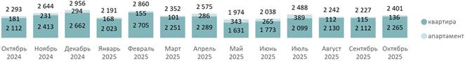 В октябре 2025 года на рынке новостроек массового сегмента было зарегистрировано 2,4 тыс. ДДУ (+8% за месяц, +5% за год).