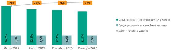 Доля сделок с привлечением ипотечного кредита в октябре составила 77% (+1 п.п. за месяц). Средняя ставка по рыночной ипотеке за месяц сократилась на 0,9 п.п. и составила 21,2%.